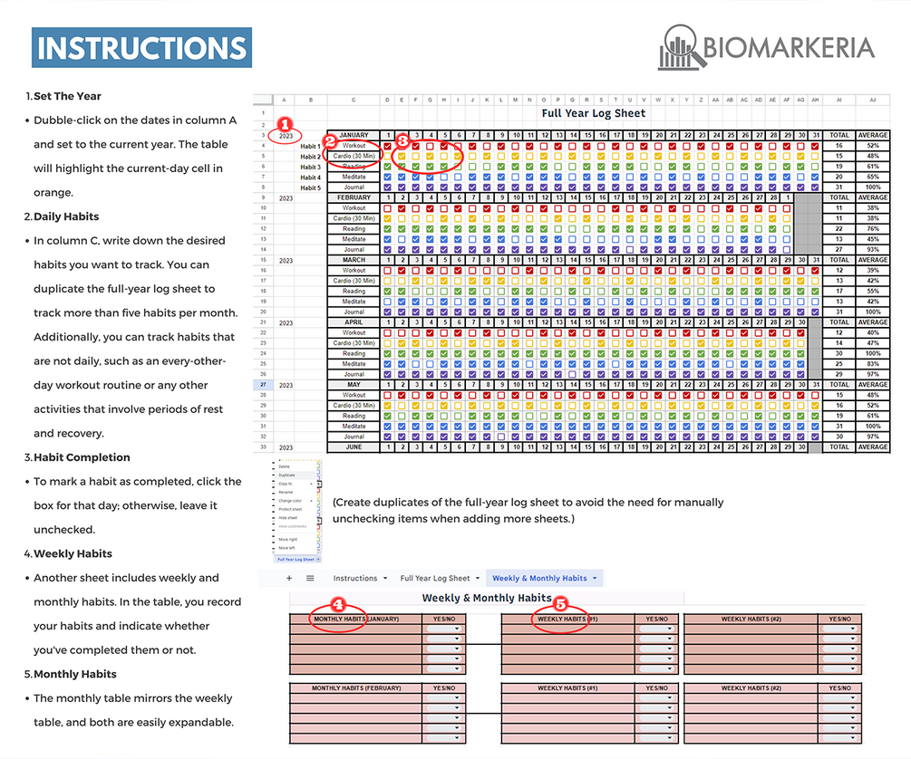 This PDF download unlocks a Google spreadsheet version of the Full Year Log Sheet, now with additional pages for tracking weekly and monthly habits. This isn’t just a chart—it’s your digital habit tracker, designed to keep you organized, motivated, and on top of every goal you’re setting for yourself. With one glance, you’ll have a clear view of your progress over the year and an opportunity to celebrate your wins or spot areas for growth.
